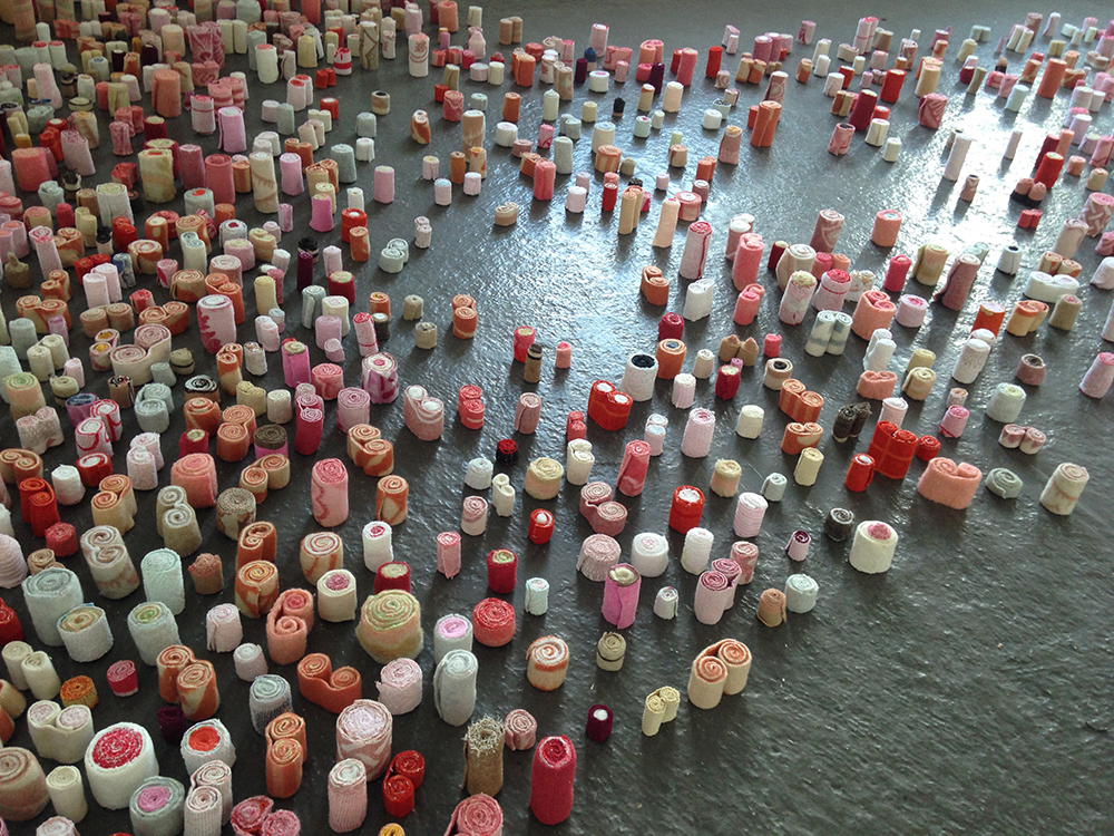 "ett myller av hårt rullade, ljusröda textilremsor som gör ett underligt levande och köttsligt intryck där de sprider sig över golvet som ett slags embryon."